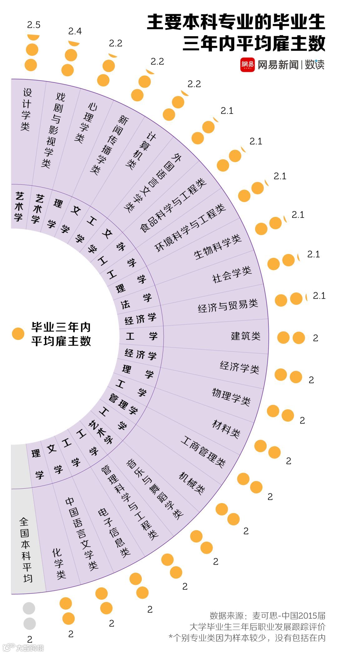 尤其是在传媒、互联网、经管等领域,频繁地跳槽已成为常见现象,也成为年轻人努力扩展事业的重要途径。《报告》显示,诸多专业的学生在毕业三年内的平均雇主数都在2-3个之间。