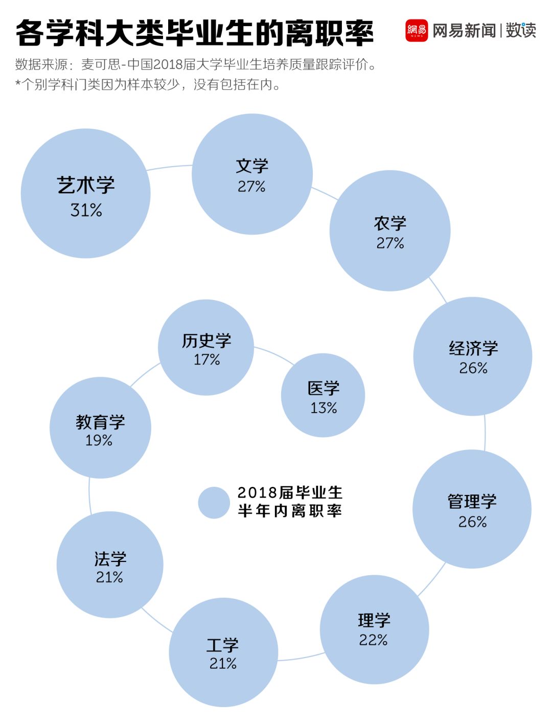 以《报告》中公布的离职率数据来看,2018届毕业生半年内的离职率多在两成以上,其中艺术学最高——近三分之一的艺术学科毕业生会在半年内再换一份工作。位列其后的为文学、农学、经济学等学科。