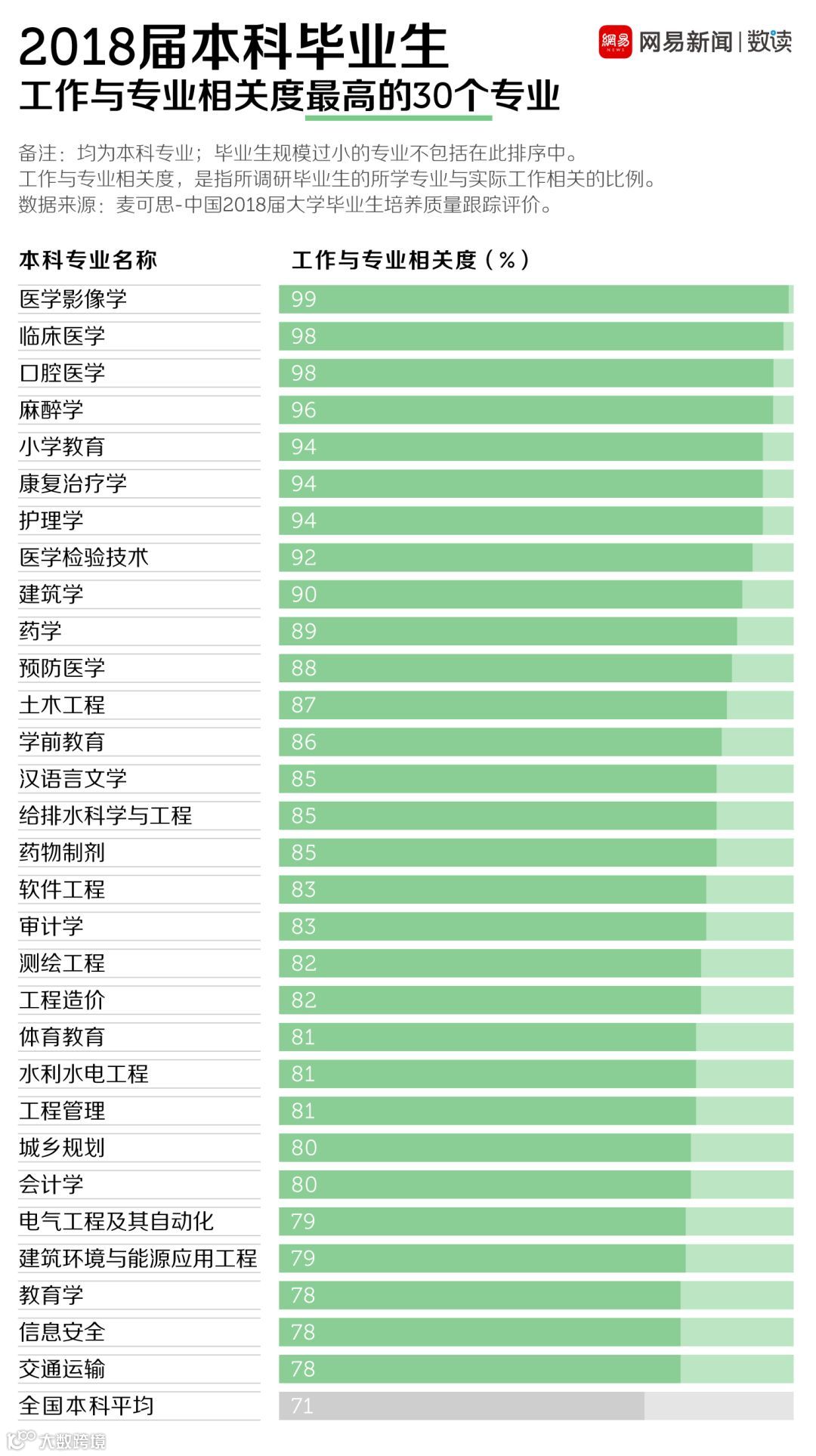 具体来看,与工作相关度最高的专业被医学占据多数。医学影像学、临床医学与口腔医学位居前三,几乎所有的毕业生都进入了与专业对应的职业轨道。