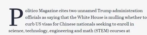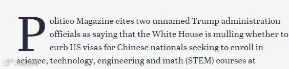 “计划制定新的政策限制签证,以防止外国人(尤其是中国人)来美国学习科学、工程、数学等知识,防止他们盗窃美国的知识产权。”