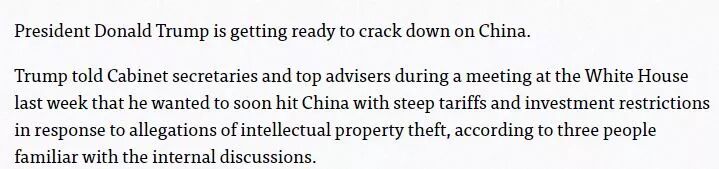上周白宫的内部会议中,他告诉内阁秘书和一些高级决策官员自己希望尽快打击中国,设置高额关税壁垒和投资限制。这是对此前美国的技术资源被偷窃的报复。”
