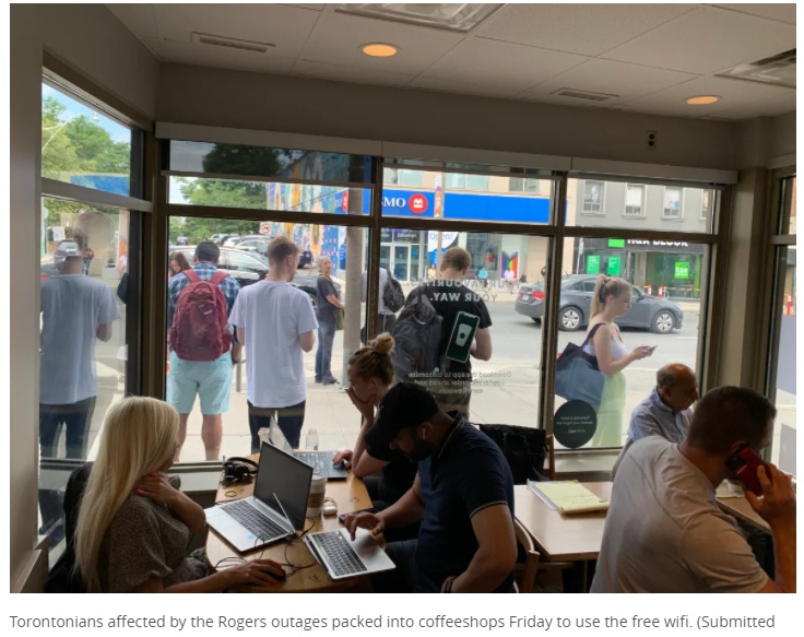 虽然周末临近,但今天还是工作日。根据7月1日的最新民调结果显示,现在还有十分之一的加拿大人还是在家远程办公的,这网一断,大家慌乱不已,纷纷抱着电脑冲向附近的咖啡馆!