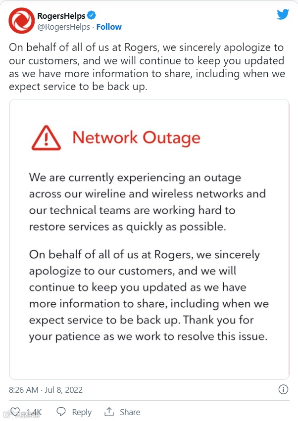 直到上午9点,Rogers公司才公开声明,承认是网路出现问题——