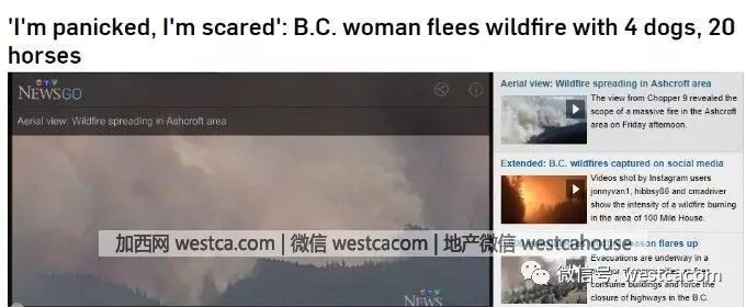 一名居住在108 Mile 的女子表示,她在没有得到何通知的情况下,突然在自家阳台看到山火席卷而来,只能带着20匹马和4只狗,苍惶出逃。
