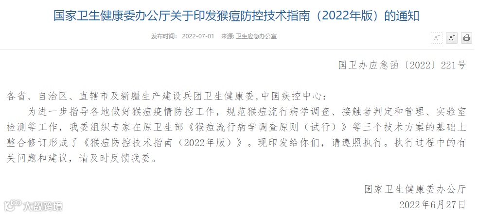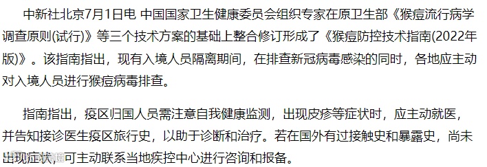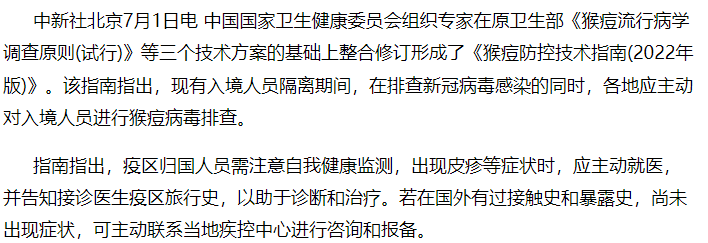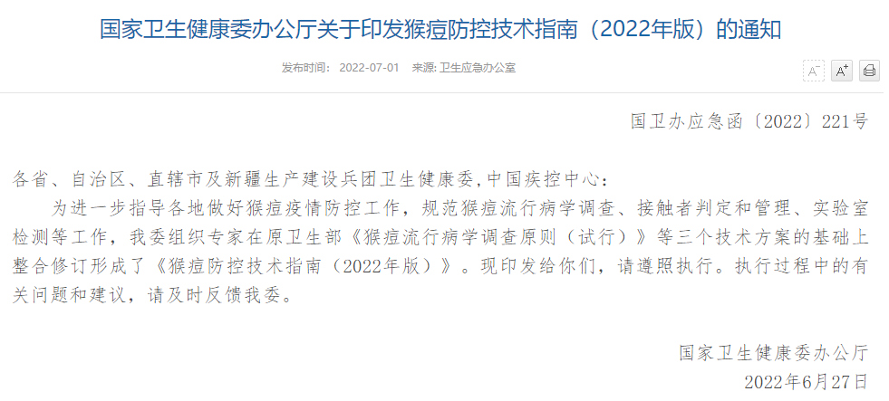 为了防控猴痘疫情,中国国家卫生健康委员会组织专家也在7月1日发布了一份《猴痘防控技术指南(2022年版)》。