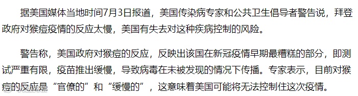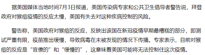 根本美国媒体7月3日的报道,美国传染病专家和公共卫生倡导者警告说,拜登政府对猴痘疫情的反应太慢,美国有失去对这种疾病控制的风险。