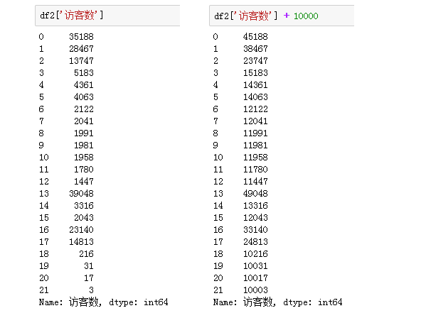 只需要选中访客数所在列,然后加上10000即可,pandas自动将10000和每一行数值相加,针对单个值的其他运算(减乘除)也是如此。