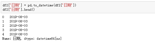 在实际业务中,一些时候PANDAS会把文件中日期格式的字段读取为字符串格式,这里我们先把字符串'2019-8-3'赋值给新增的日期列,然后用to_datetime()函数将字符串类型转换成时间格式: