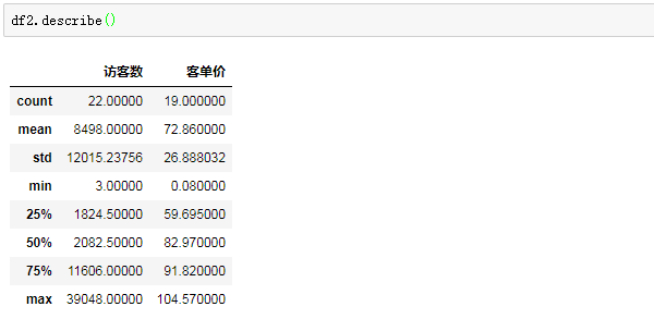 我们本来有5列数据,为什么返回结果只有两列?那是因为这个操作只针对数值型的列。其中count是统计每一列的有多少个非空数值,mean、std、min、max对应的分别是该列的均值、标准差、最小值和最大值,25%、50%、75%对应的则是分位数。
