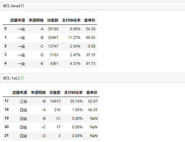 很多时候我们想要对数据内容做一个总览,用df.head()函数直接可以查看默认的前5行,与之对应,df.tail()就可以查看数据尾部的5行数据,这两个参数内可以传入一个数值来控制查看的行数,例如df.head(10)表示查看前10行数据。