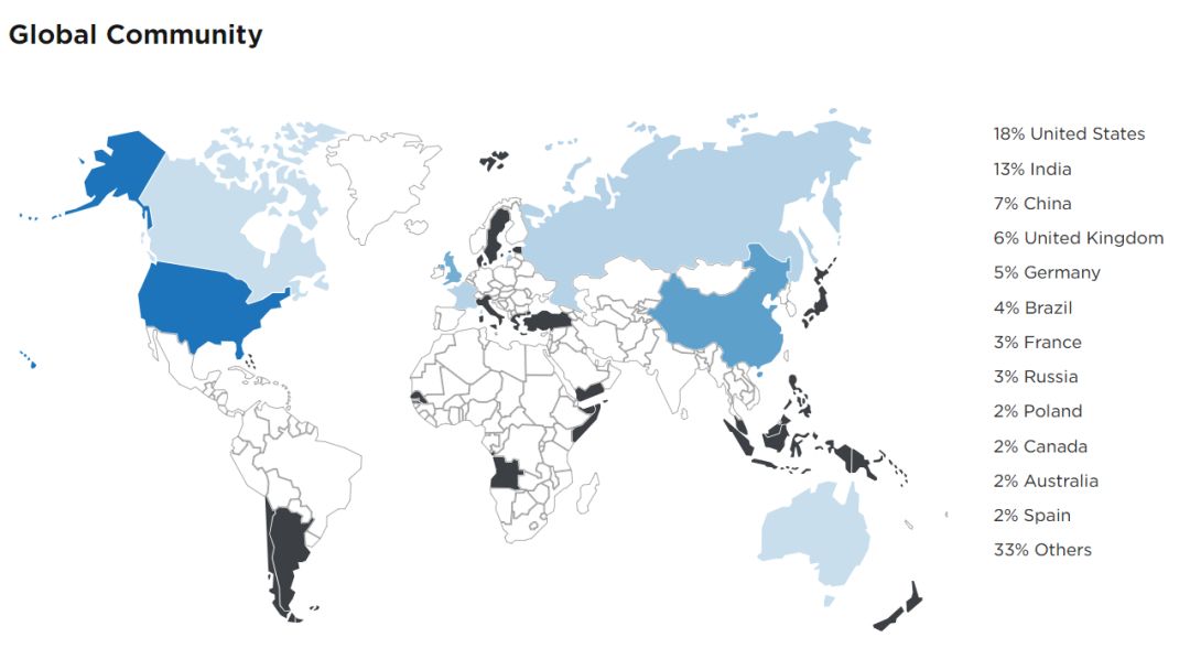 Python开发者占比比较多的依次是美国、印度、中国(2017年的调查数据,仅供参考)
