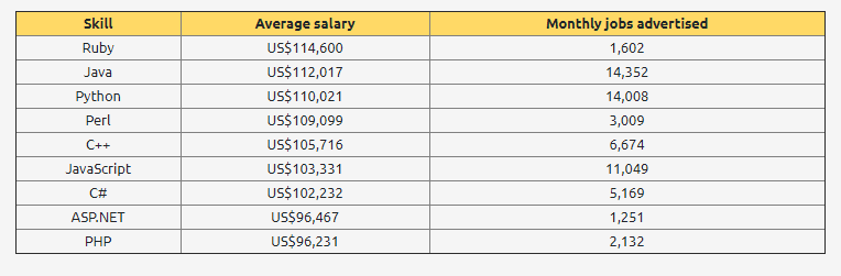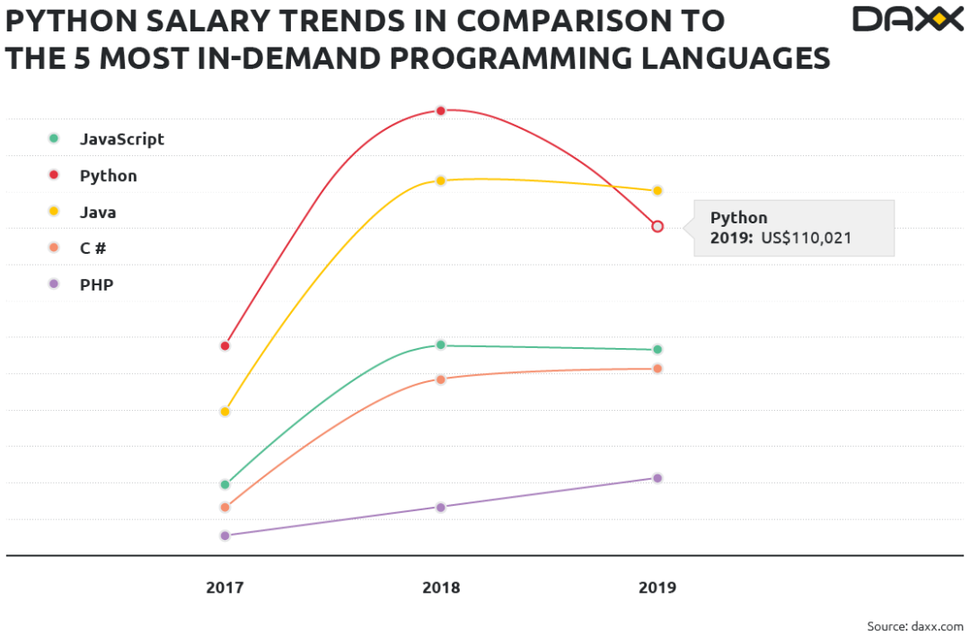 根据Gooroo的说法,Python开发人员的平均工资是每年110,021美元,这使得Python成为该国第三大收入最高的编程语言,只有Java和Ruby领先。