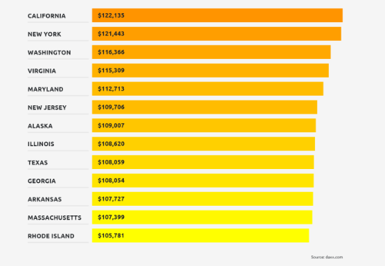 根据Gooroo的说法,美国平均Python开发者薪水为110,021美元。纽约和加利福尼亚拥有最高的Python开发人员薪水——相应的122,135美元和121,443美元。