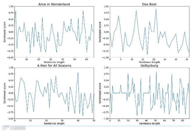 上面两张图中,第一张里面的电影《爱丽丝梦游仙境(Alice in Wonderland)》的开头和结尾都很积极,电影《靴子(Das Boot)》和《一个男人(A Man for All Seasons)》每一季的开头和结尾都是消极的。电影《葛底斯堡(Gettysburg)》展示了命运的逆转,开始时是消极的,结束时是积极的。人们普遍注意到,这些成功的电影有频繁的情绪波动。