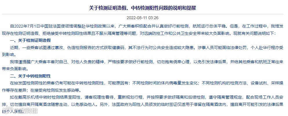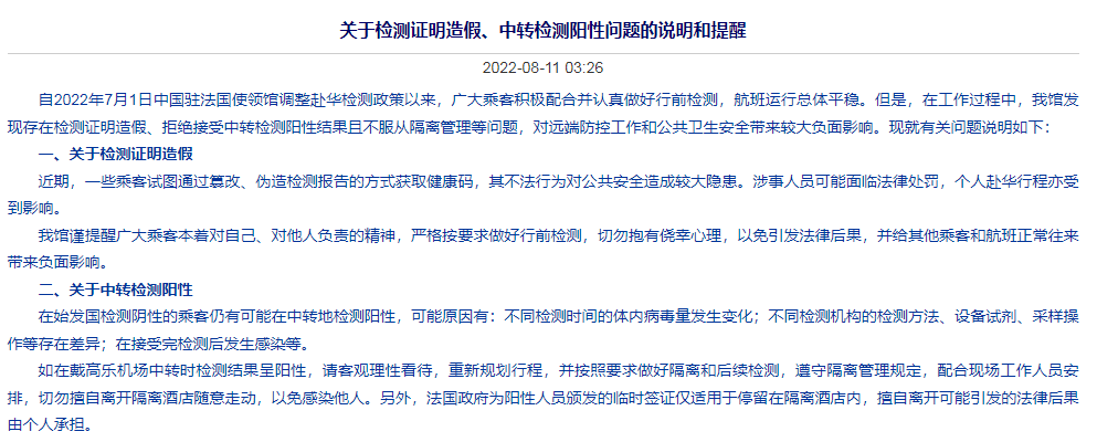 近日,中国驻法国使领馆发布了一项关于检测证明造假、中转检测阳性问题的说明和提醒。