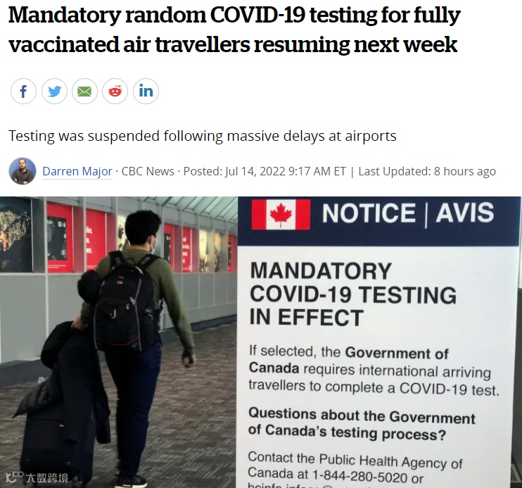为此,加拿大联邦政府表示,从7月19日起,他们将开始对入境加拿大的航空旅客进行强制随机COVID-19检测。