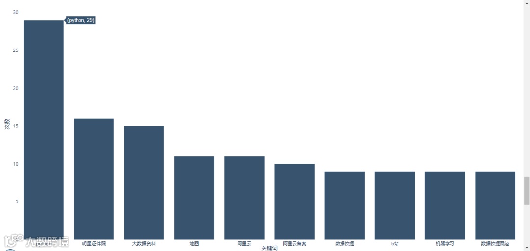 然后统计出了搜索最多的十个关键词,python 居然是第一位!前十中基本都是数据编程相关的,没想到自己这么爱学习。