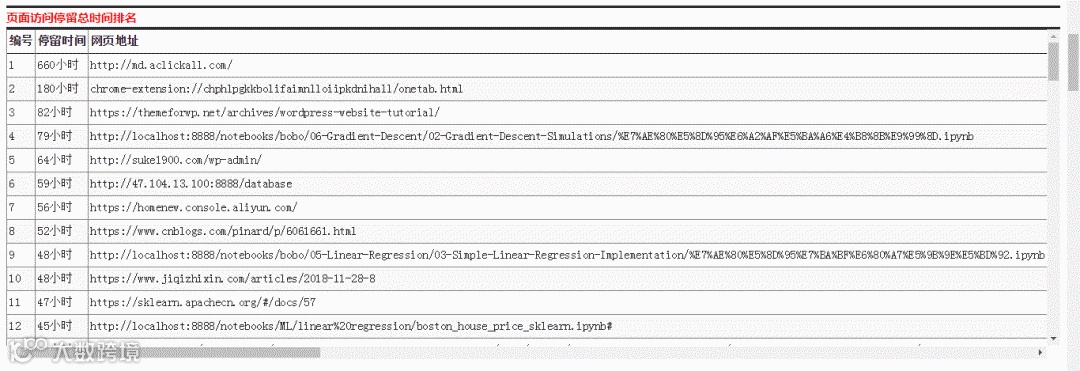 然后又统计了停留时间最长的网页页面,在 http://md.aclickall.com/ 这个网站居然停留了 660 小时,这是个文章排版网站,因为经常要排版所以把该页面固定了起来。