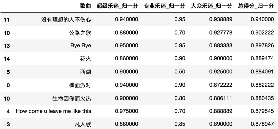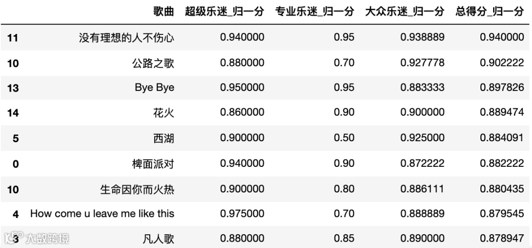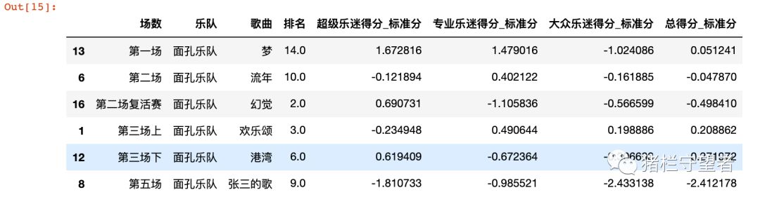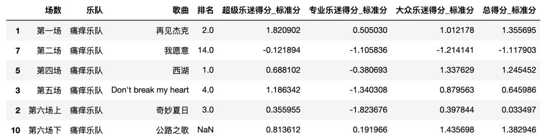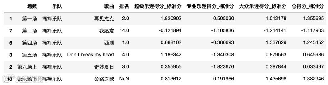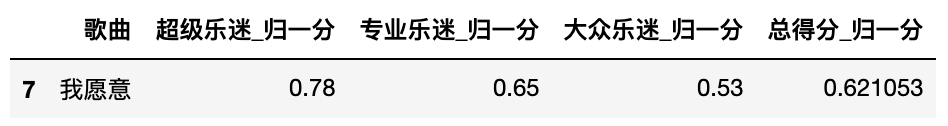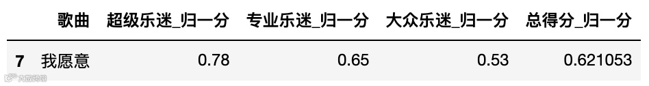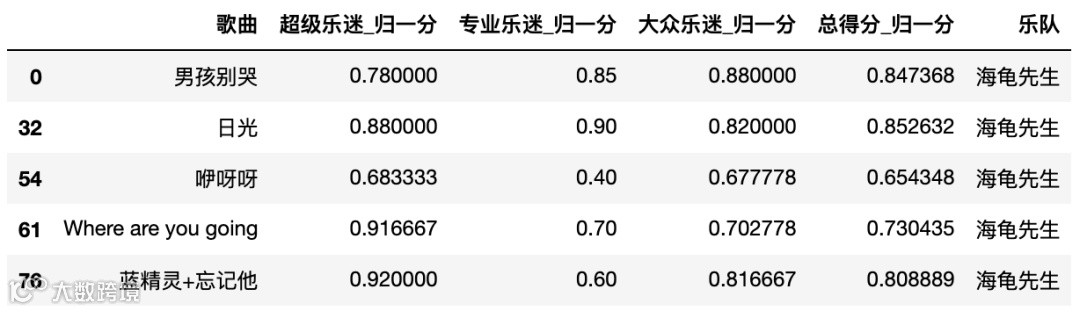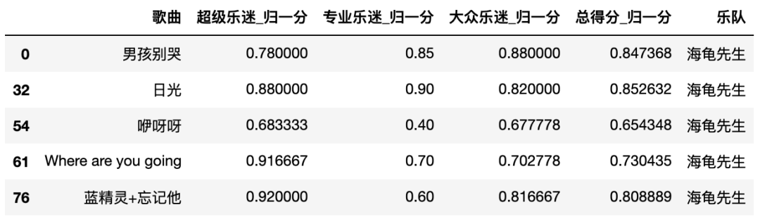 total_nor_score_t = pd.merge(total_nor_score, total_score[['乐队','歌曲']], on='歌曲')total_nor_score_t[total_nor_score_t['乐队'] == '海龟先生']