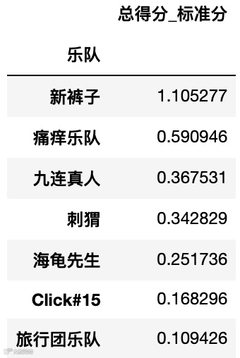 # 按照乐队这个标签分类计算,计算方式是平均值,计算字段是总得分_标准分,然后按照总得分_标准分排列total_score_mean = total_score.groupby(['乐队'])[['总得分_标准分']].mean().sort_values( by = '总得分_标准分',ascending = False)total_score_mean