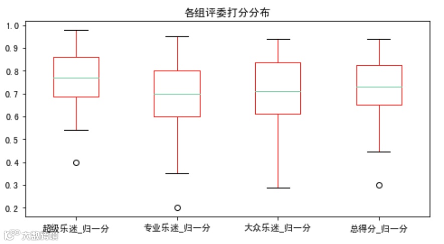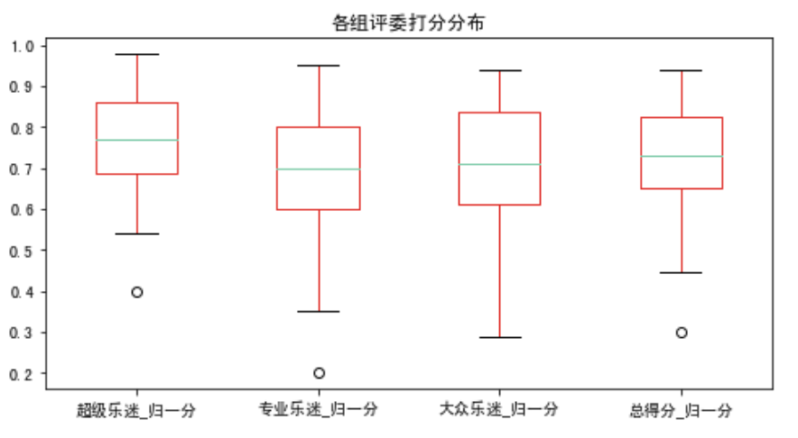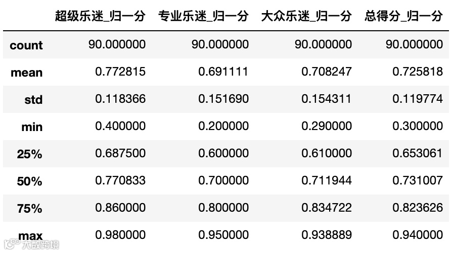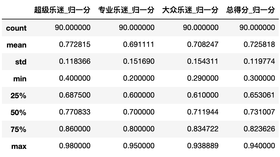 # 定义归一化的函数def normalize(series,x_max):return series.apply(lambda x: x/x_max)# 对不同总分不同类别的得分应用归一化函数for data in [data1,data2,data5,data6]: data['超级乐迷_归一分'] = normalize(data['超级乐迷得分'],50)data3['超级乐迷_归一分'] = normalize(data3['超级乐迷得分'],60)data4['超级乐迷_归一分'] = normalize(data4['超级乐迷得分'],40)for data in [data1,data2,data3,data4,data5,data6]: data['专业乐迷_归一分'] = normalize(data['专业乐迷得分'],40) for data in [data1,data2]: data['大众乐迷_归一分'] = normalize(data['大众乐迷得分'],100)for data in [data3,data4,data5,data6]: data['大众乐迷_归一分'] = normalize(data['大众乐迷得分'],360)