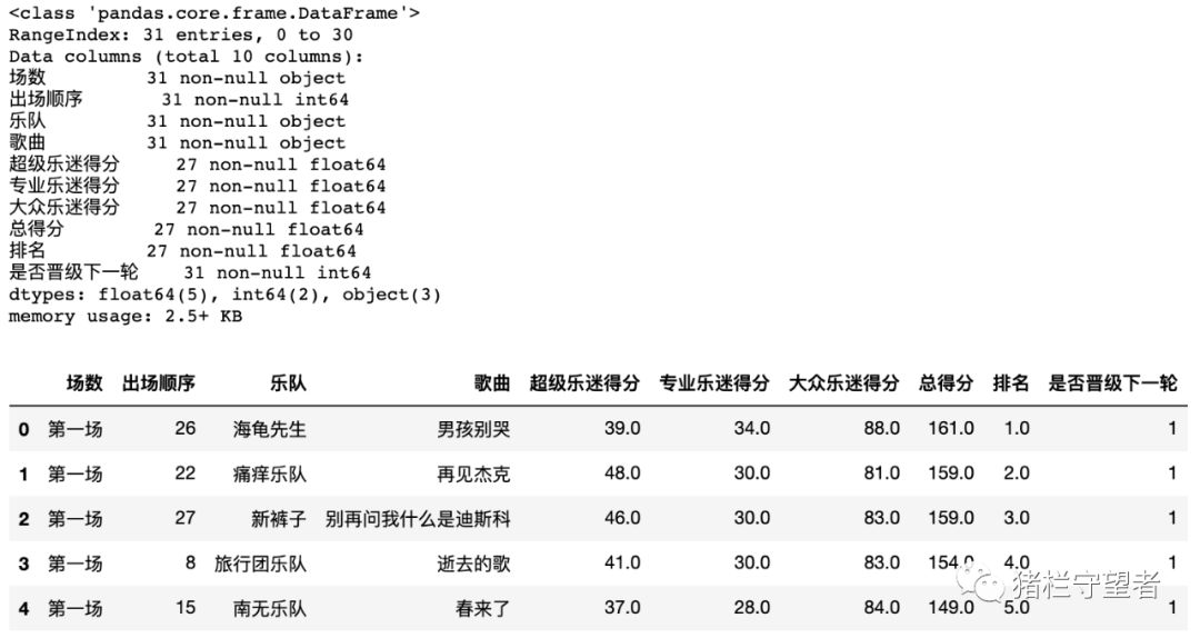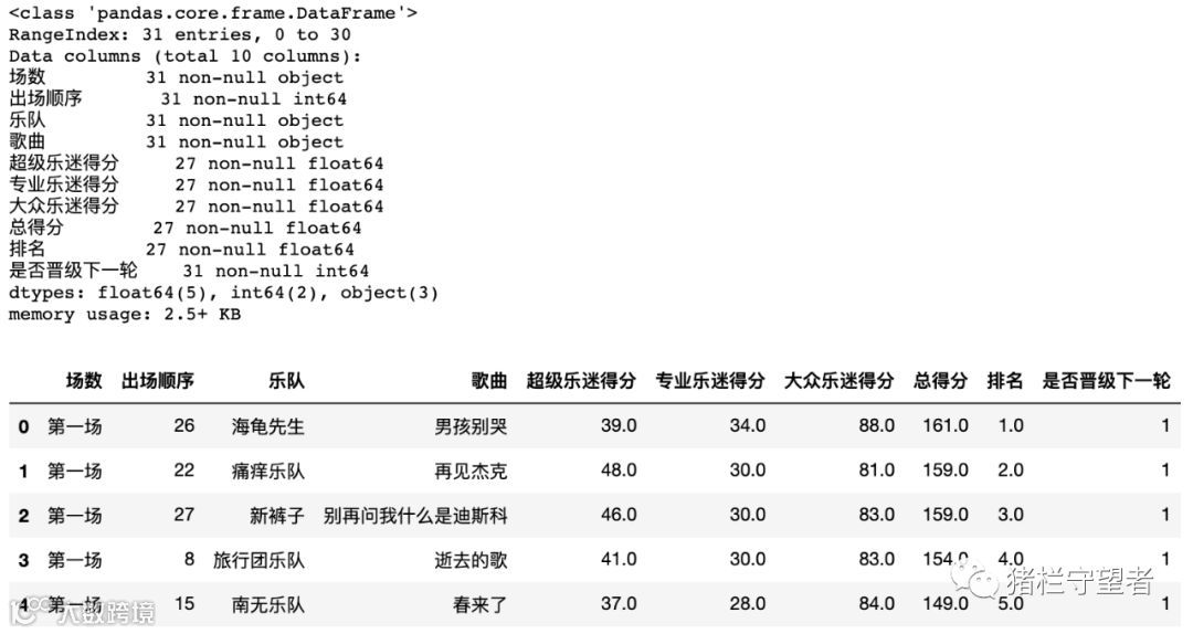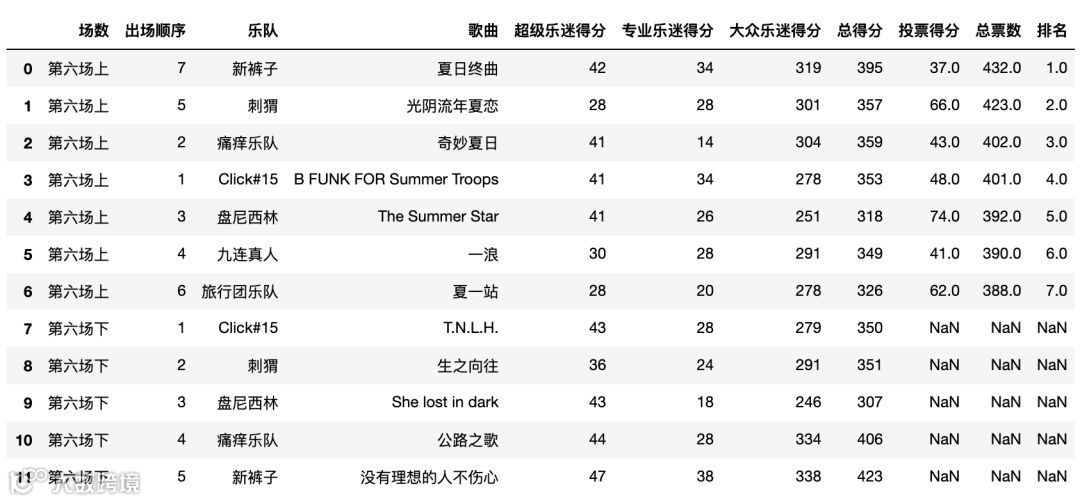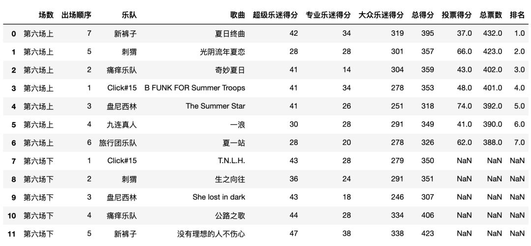 # 读取数据data1 = pd.read_excel('/.../乐队的夏天.xlsx','第一场')data2 = pd.read_excel('/.../乐队的夏天.xlsx','第二场两两PK赛')data3 = pd.read_excel('/.../乐队的夏天.xlsx','第三场累计积分赛')data4 = pd.read_excel('/.../乐队的夏天.xlsx','第四场复活赛')data5 = pd.read_excel('/.../乐队的夏天.xlsx','第五场9进7')data6 = pd.read_excel('/.../乐队的夏天.xlsx','第六场总决赛')
