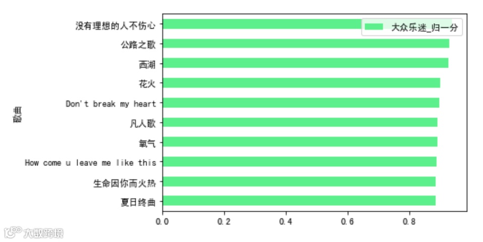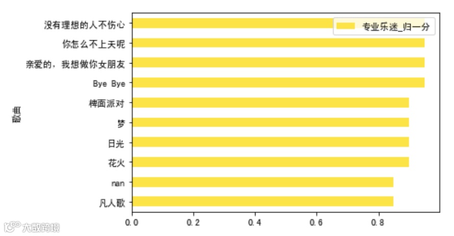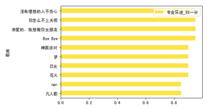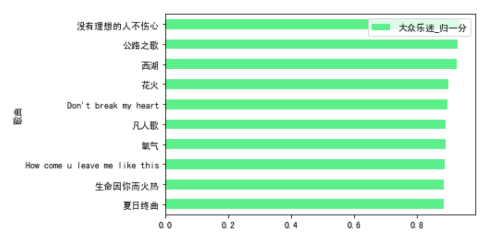 total_nor_score.sort_values(by = '超级乐迷_归一分').tail(10).plot.barh(x='歌曲',y='超级乐迷_归一分',color=red)total_nor_score.sort_values(by = '专业乐迷_归一分').tail(10).plot.barh(x='歌曲',y='专业乐迷_归一分',color=yellow)total_nor_score.sort_values(by = '大众乐迷_归一分').tail(10).plot.barh(x='歌曲',y='大众乐迷_归一分',color=green)