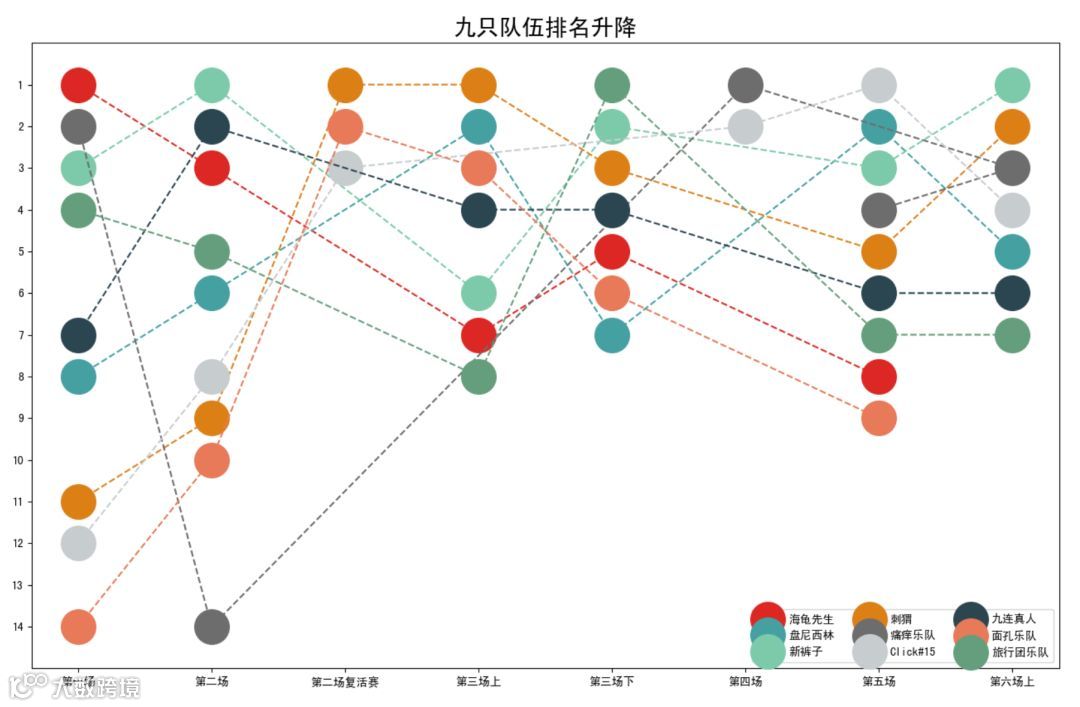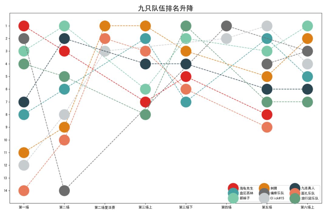 接下来对比较熟悉的9只乐队的每期排名做可视化,直观地展现他们在每期表现的升降。