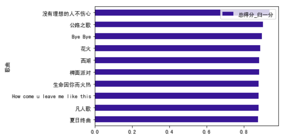 top10_songs = total_nor_score.sort_values(by = '总得分_归一分').tail(10)top10_songs.plot.barh(x='歌曲',y='总得分_归一分',color=purple)print('截止第六期,最受欢迎的10首歌分别是:\n',list(top10_songs['歌曲']))