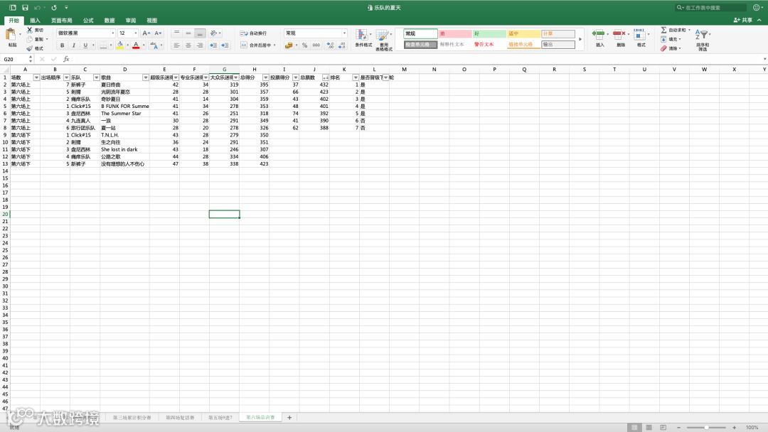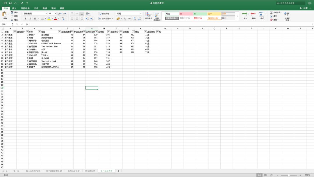 一共有6个sheet,对应6场比赛,字段分别是:[场数, 出场顺序, 乐队, 歌曲, 超级乐迷得分, 专业乐迷得分, 大众乐迷得分, 总得分, 排名, 是否晋级下一轮]
