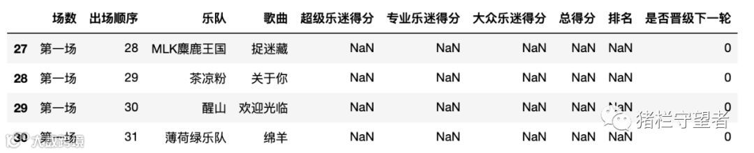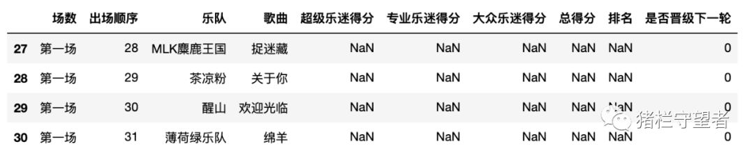 # 可以看到有四只乐队是没有得分和排名的,把他们列出来data1[data1['总得分'].isnull()]