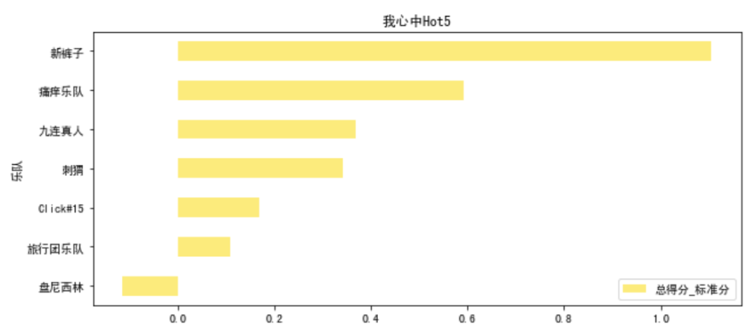 # 选中7只队伍final_7 = ['新裤子','痛仰乐队','九连真人','Click#15','刺猬','盘尼西林','旅行团乐队']# 分别计算标准分final_7_total_score = total_score_mean.loc[final_7,].sort_values(by='总得分_标准分')# 可视化fig,ax = plt.subplots(1,1,figsize = (10,20))final_7_total_score.plot.barh(ax=ax,color = yellow,alpha=0.7,title='我心中Hot5',grid=False)