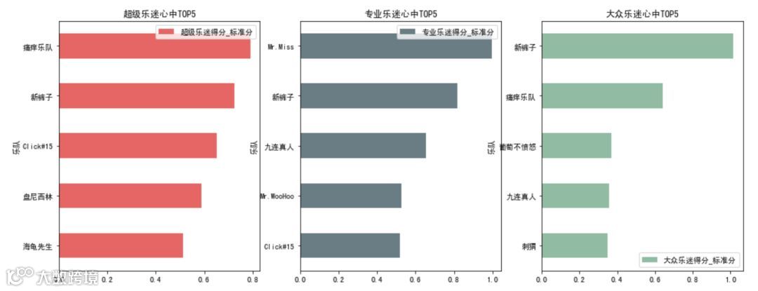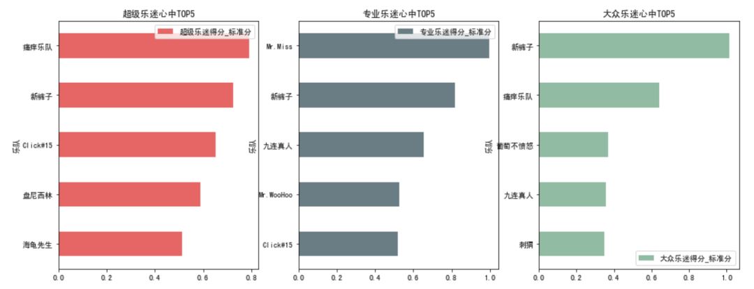 接下来我想研究,在超级乐迷、专业乐迷和大众乐迷各自眼里,哪些乐队是他们喜欢的,他们共同喜欢的,和差异很大的乐队分别是哪些?