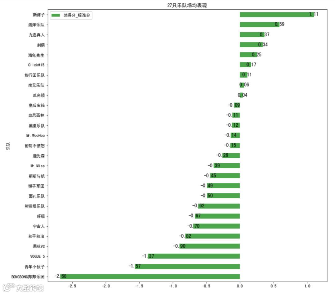首先我们分析乐队,通过27只乐队在目前5场比赛中所表演的曲目的总得分的标准分的平均分,来衡量乐队的整体表现。