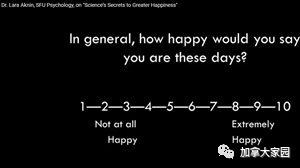 她说:"我是西蒙·弗雷泽大学的社会心理学教授。我要给大家介绍的研究成果题目是:使人更快乐的科学根据。能为别人花费时间和金钱的人通常比那些只考虑自己的人更快乐。尤其是基于一些正确的理由为别人花钱就更让花钱者觉得快乐"。