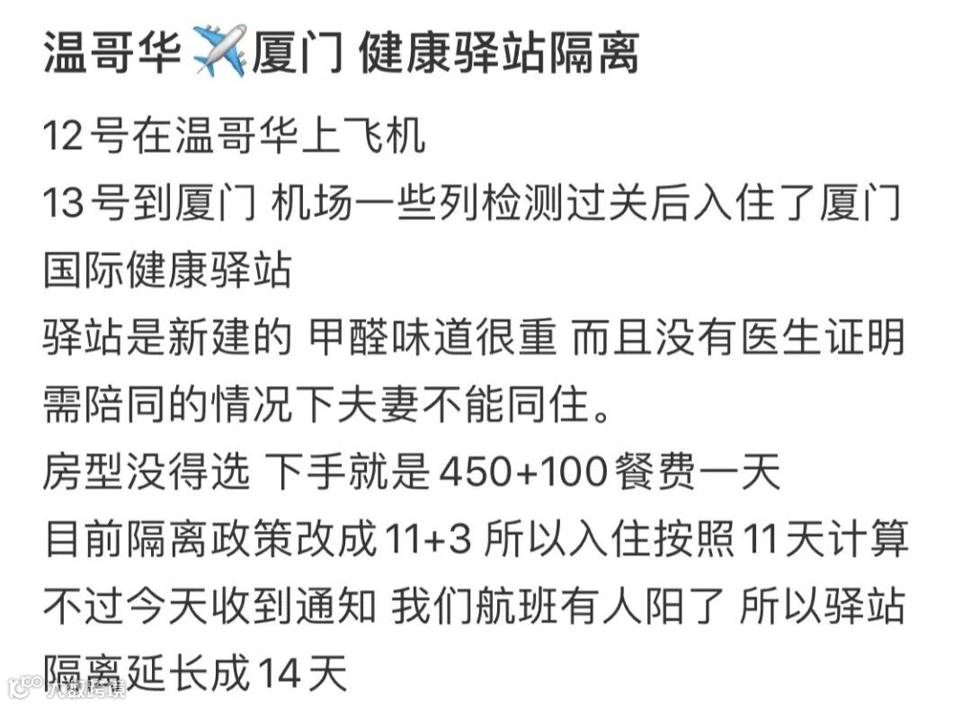 其中一位网友表示,他是于4月12号在温哥华上飞机,13号抵达厦门,在机场经过一些基本的检测后就入住了厦门国际健康驿站。