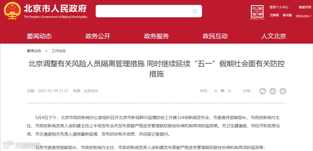 根据北京市人民政府的官网,5月4日下午,北京市政府新闻办公室组织召开北京市新冠肺炎疫情防控工作第324场新闻发布会,发布首都严格进京管理联防联控协调机制两项防疫政策。