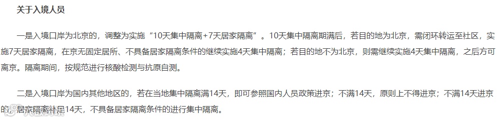 1. 入境口岸为北京的,调整为实施“10天集中隔离+7天居家隔离”。