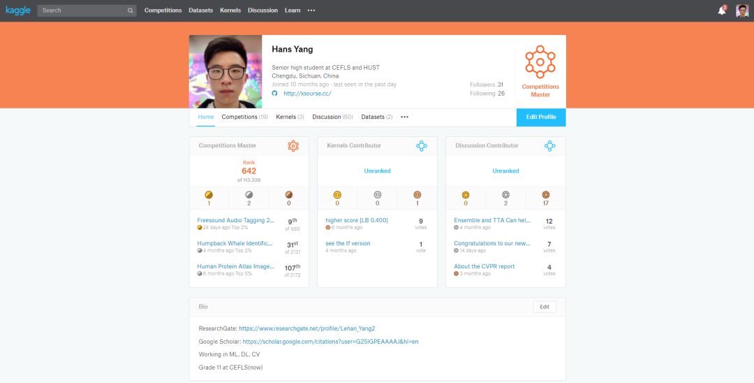 "我最近成为Master之后才加入了华人Master社区,相信以后会有很多机会和这个社区内的大佬们合作。同龄人的话有一些但是不多,比如AL大佬就是目前kaggle高中生中排名最靠前的(他马上去CMU了)"