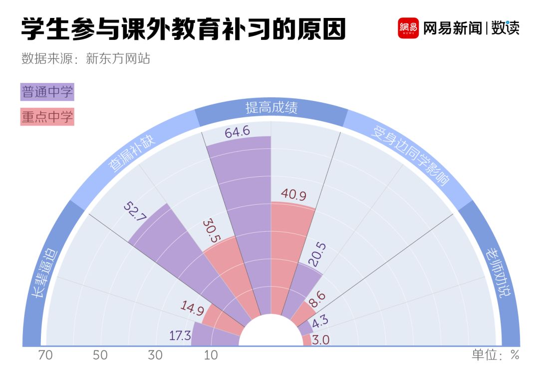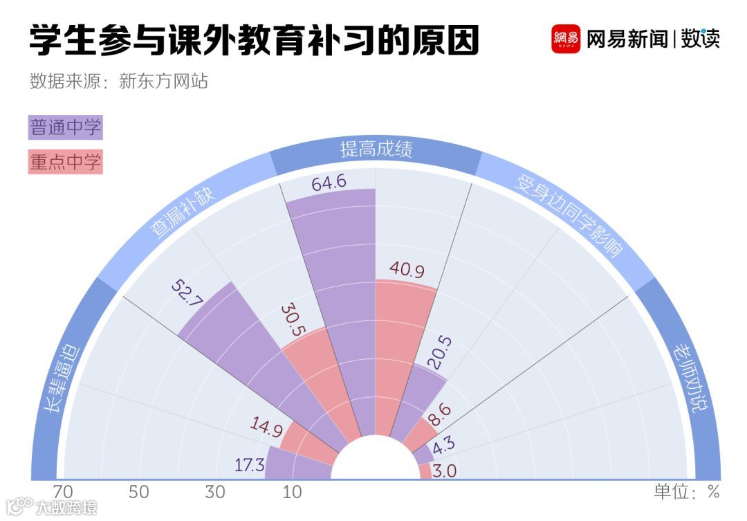 北京大学中国教育财政科学研究所发布的《中国新业态发展报告(2017)》也显示,虽然中学生参加补习的原因主要是“查漏补缺”和“提高成绩”,但“长辈逼迫”、“受身边同学影响”的也有不少。[3]