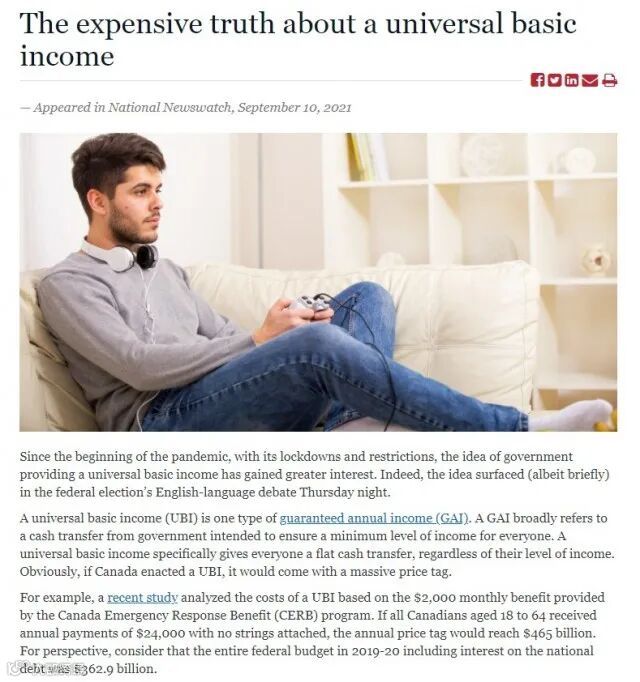 菲莎报告警告,搞全民基本收入,加拿大人要做好其他心理准备,像这类统一保障收入,要么导致国家债务大幅上升,要么导致政府赋税大幅上调。