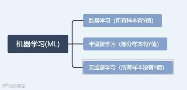 按照数据集有没有Y值可以将机器学习分为监督学习、半监督学习和无监督学习。监督学习是分类算法,无监督学习是聚类算法。