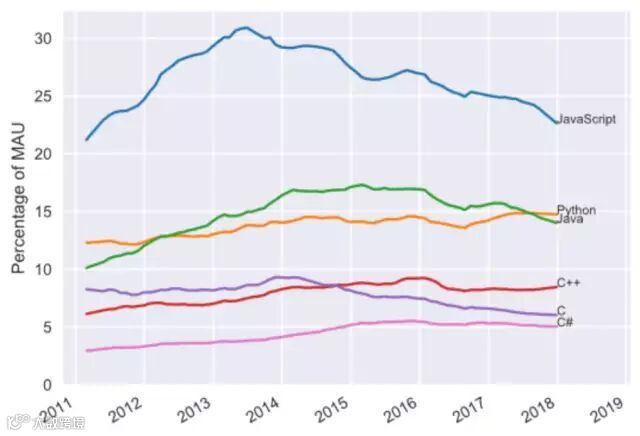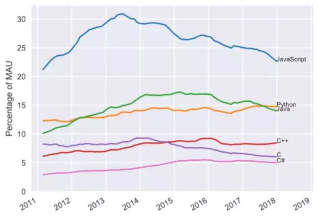后来发现程序员也有好多种类的,前端后端等,因此敲的代码种类也很多,才会有几十种的编程语言,下图是一些这几年的主流语言。