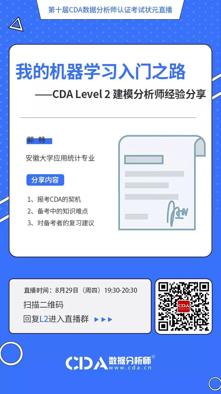 但是后台还是收到了许多小伙伴关于CDA考试方面的问题,所以我们特别邀请到了:本届考试 Level 2 建模方向中的优秀考生郭畅。