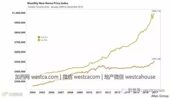 最近的2011年,新建公寓的平均价格和新独立屋平均价格之间的差距小于10万元 。到2016年,差距已增加到约50万元。现在,从多伦多公寓升级到独立屋的成本要比五年前高得多。