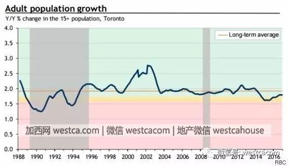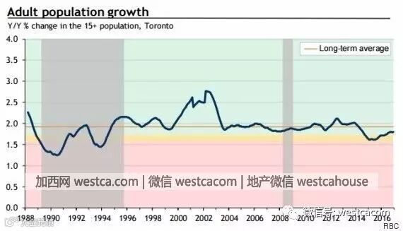 90年代多伦多遭遇长达7年多的房屋泡沫破裂的常见原因之一是由于人口变化,住房年龄人口的增长显著减少。好的,现在正在人口正在发生变化了,多伦多的成年人口增长比几年前放慢,低于平均水平。
