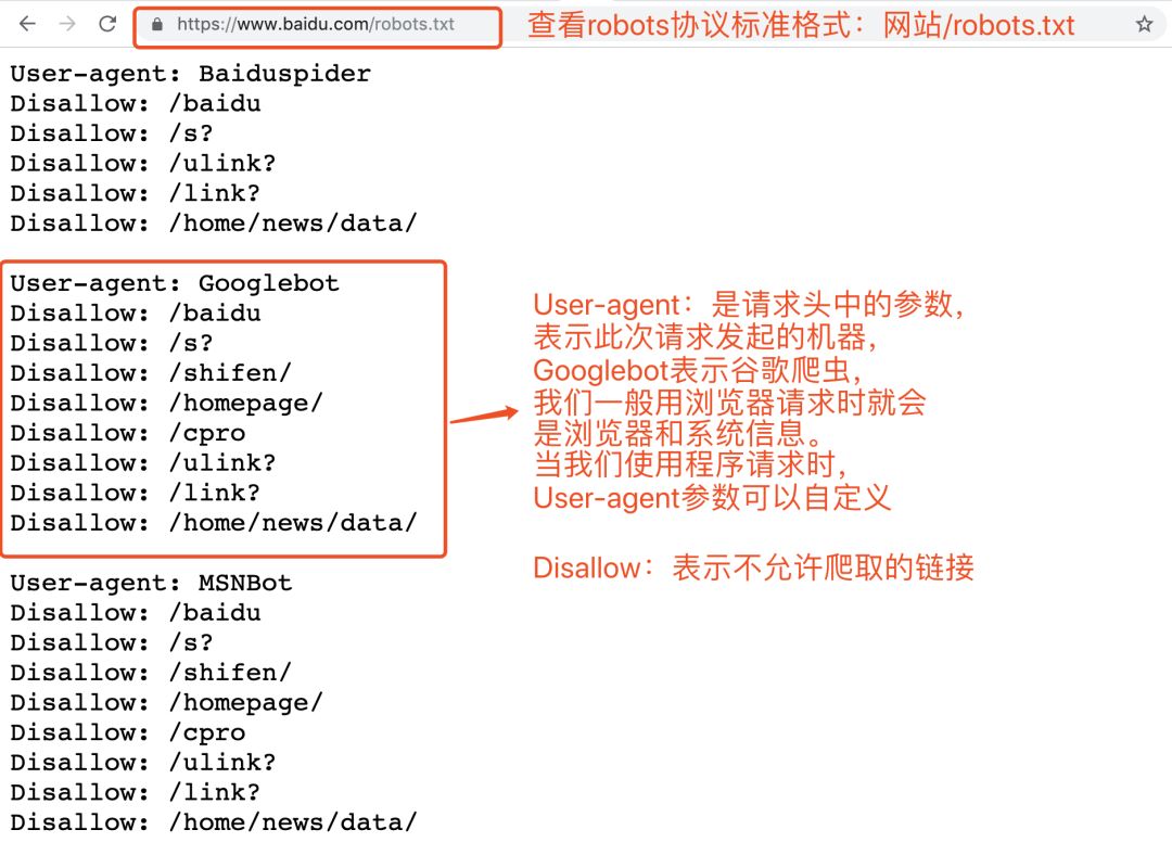 这表示除上面那些定义过的爬虫以外其他爬虫都不允许爬取百度任何东西!