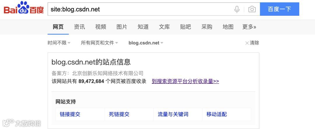 搜索引擎:如Google、百度、雅虎、搜狗、必应等等很多搜索引擎其本质就是一个(可能多个)巨大爬虫,这些搜索引擎工作原理是:页面收录->页面分析->页面排序->响应关键字查询,也就是说它会先把互联网上很多页面保存到服务器,然后分析网页内容建立关键字索引,最后用户输入关键字的时候去查询内容,然后根据相关性排序(百度害人的竞价排名毫无相关性可言),第一步的页面收录就是爬虫,百度查看一个网站有多少网页被收录方法,百度输入:site:你想查询的网站,如:site:blog.csdn.net。