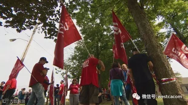 [Unifor Northstar Areospace] 工会成员在安大略省米尔顿市工厂外面抗议,该工厂计划在两个月内关闭。 (CBC)