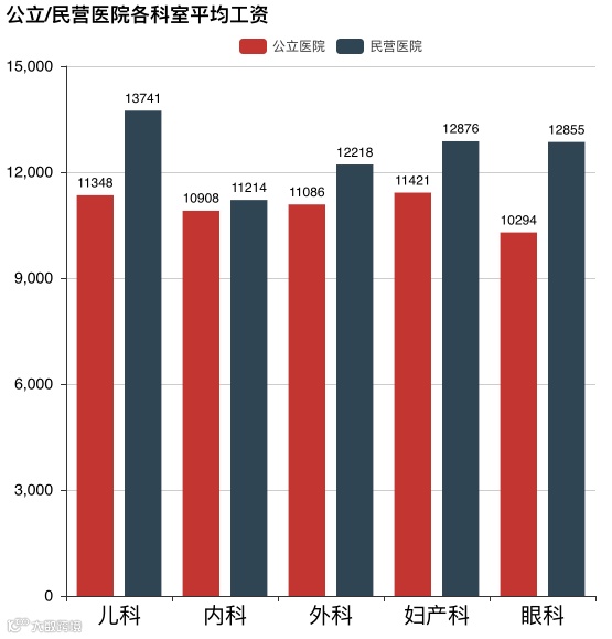 奇怪,数据显示的是儿科医生的工资是最高的呀!不是说儿科医生是干最累的活儿,拿最低的工资吗?别急,看看公立和民营的对比。